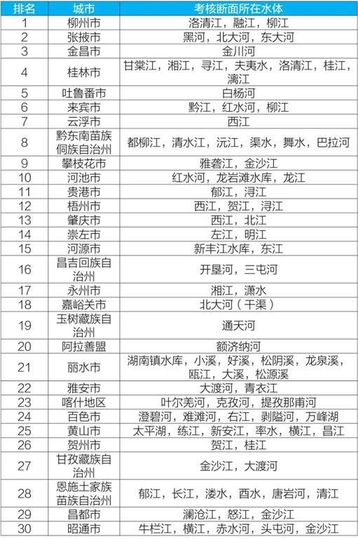 參加排名的全國地級及以上城市,覆蓋2050個(gè)國控?cái)嗝妫ㄆ渲?940個(gè)為國家地表水考核斷面,110個(gè)為入??刂茢嗝妫?。2020年10月,全國地級及以上城市中,桂林、柳州和吐魯番等30個(gè)城市國家地表水考核斷面水環(huán)境質(zhì)量相對較好(從第1名至第30名),滄州、商丘和聊城等30個(gè)城市國家地表水考核斷面水環(huán)境質(zhì)量相對較差(從倒數(shù)第1名至倒數(shù)第30名);2020年1-10月,全國地級及以上城市中,柳州、張掖和金昌等30個(gè)城市國家地表水考核斷面水環(huán)境質(zhì)量相對較好(從第1名至第30名),銅川、滄州和邢臺(tái)等30個(gè)城市國家地表水考核斷面水環(huán)境質(zhì)量相對較差(從倒數(shù)第1名至倒數(shù)第30名)。詳細(xì)見附表1~附表4。